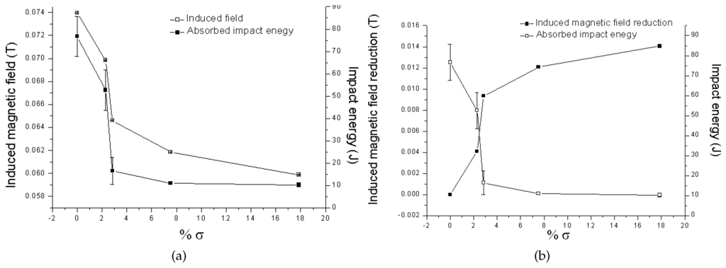 (a) Induced magnetic field and absorbed energy in terms of sigma phase percentage; (b) induced magnetic field reduction due to sigma phase in function of absorbed energy.