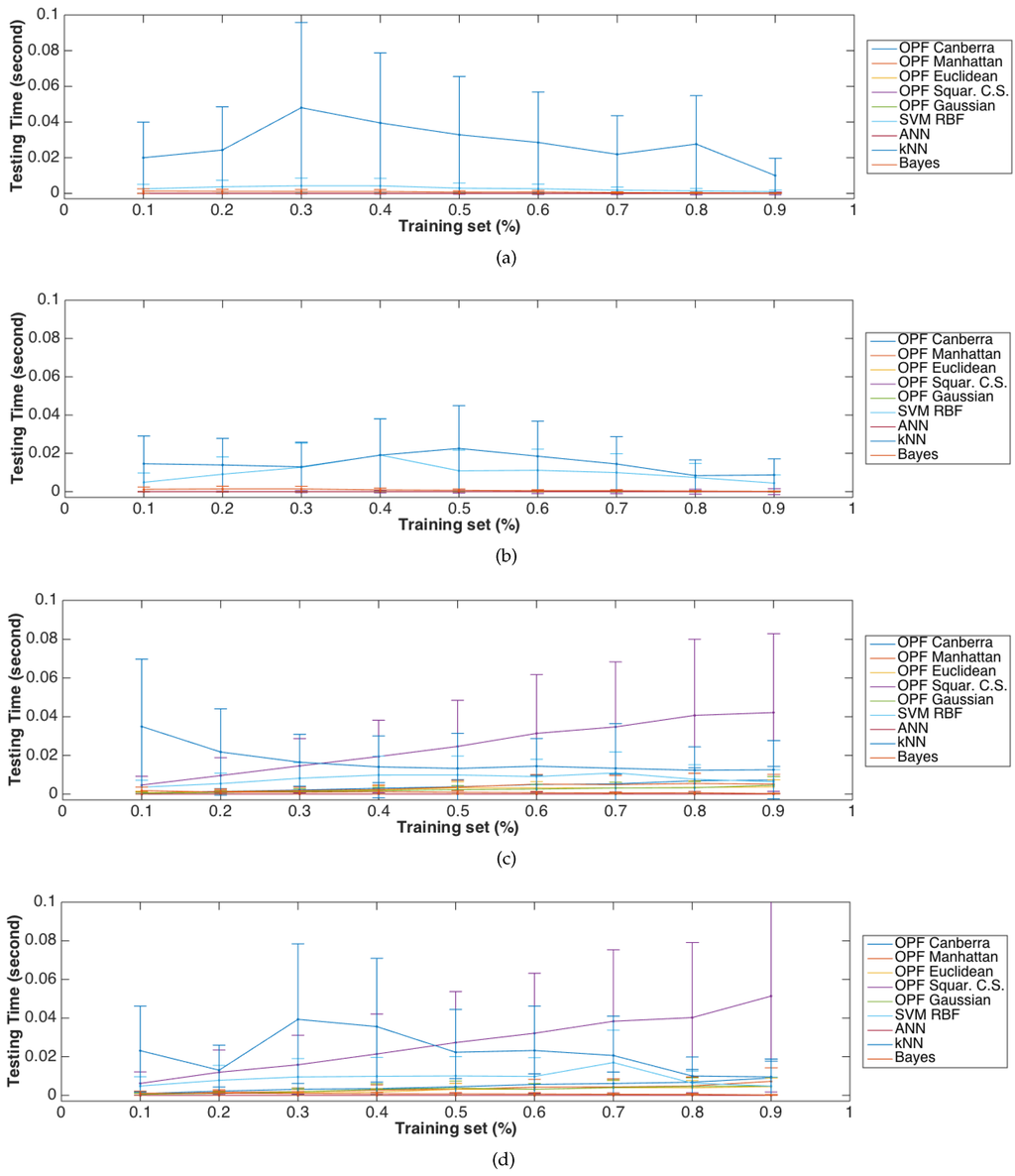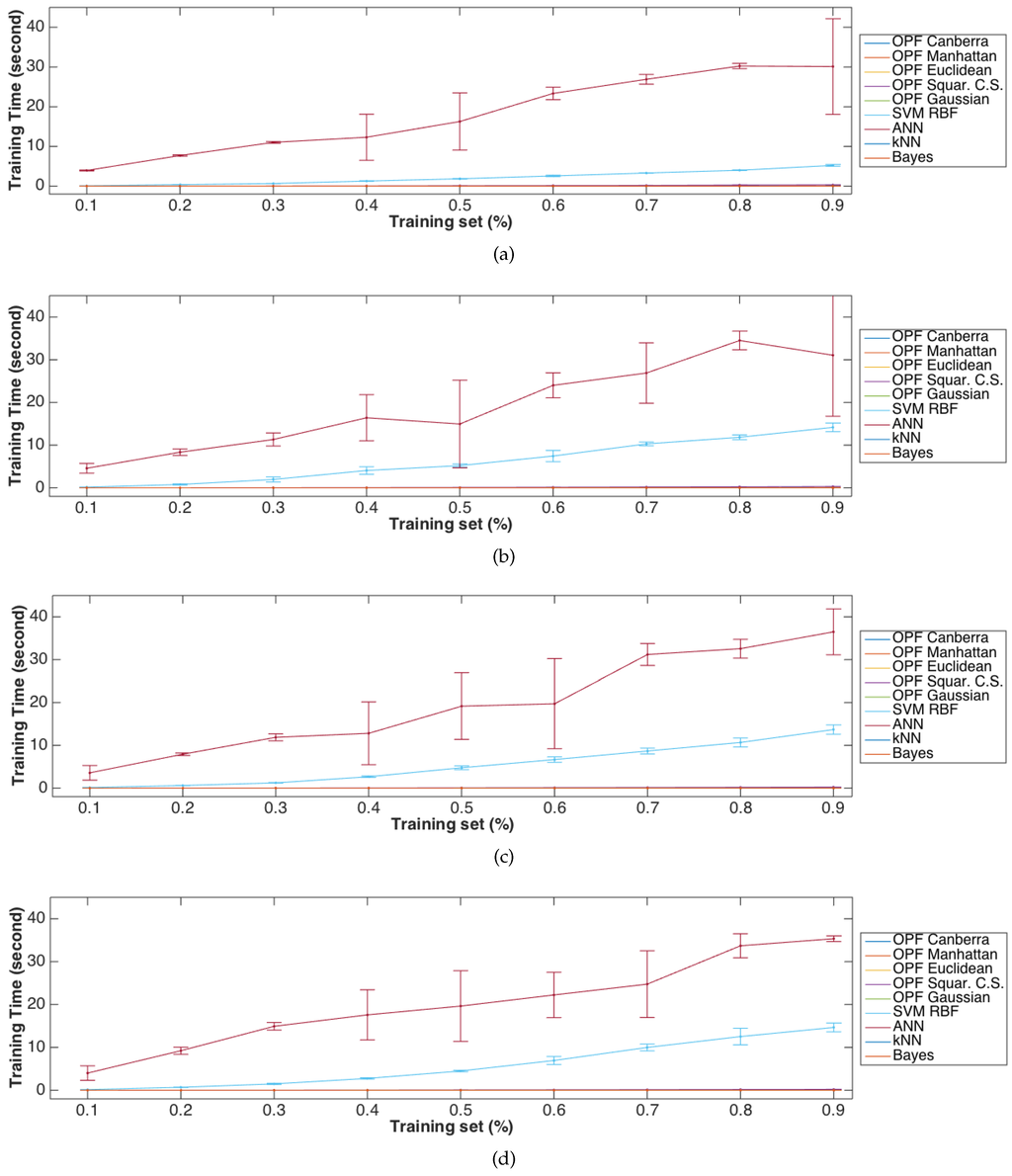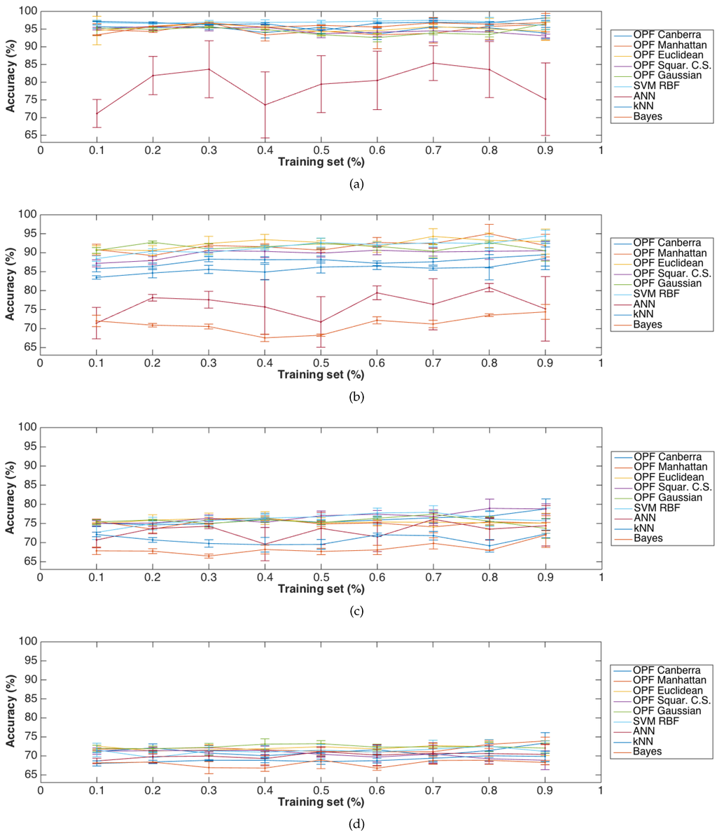 The computer classifiers under comparison are: kNN (k-Nearest Neighbour), Bayes, ANN (Artificial Neuronal Network), SVM with RBF kernel, and OPF with Canberra, Manhattan, Euclidean, square chi-square and Gaussian distances, which were tested using a notebook with an Intel Core i5 1.4 GHz processor, Santa Clara, CA, USA), 4 GB of RAM and running MAC OS X 10.10.5, Cupertino, CA, USA). Figure 6, Figure 7 and Figure 8 show the results obtained based on the Holdolt method. According to this method, part of the samples are used to train and the remaining ones to test, i.e., to validate, the classifiers. Therefore, the training percentage used in the experiments varied from 10% to 90% with increments of 10%, being the remaining samples used to test. Hence, for example, when 20% of the samples were used for training, 80% were used for testing.