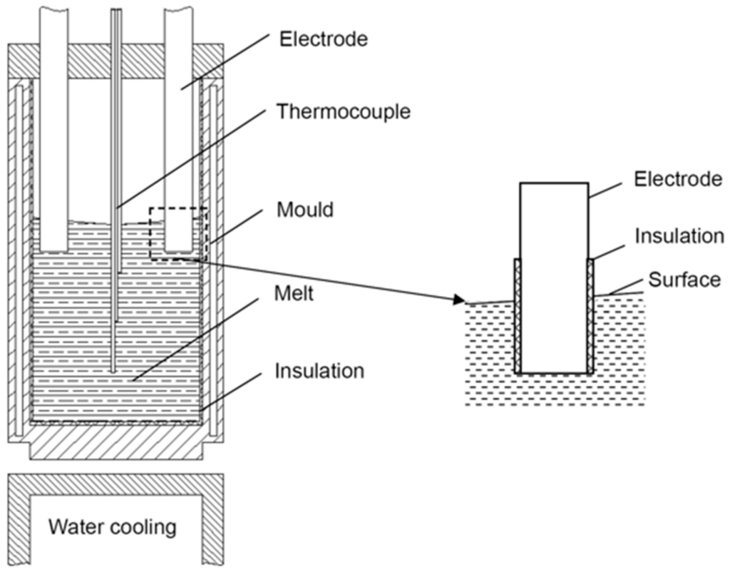 The preparatory samples for solidification experiments were re-melted in a double-walled cylindrical stainless steel mold with an inner-diameter of 50 mm (see Figure 1). In order to sufficiently remelt the samples, their temperature was heated up to 750 °C in a resistance furnace (Carbolite, Gpc 1300) and kept constant for 45 min, and then deceased to 720 °C and kept for another 30 min. After that, the mold with the melt was taken from the furnace. Then, both NiCr-Ni thermocouples and two parallel cylindrical stainless steel electrodes, fixed at a steel lid, were inserted into the melt through the free surface. Finally, the mold was cooled in air. ECP or TMF was applied during different stages of the cooling process to investigate the efficient grain refinement formation period.