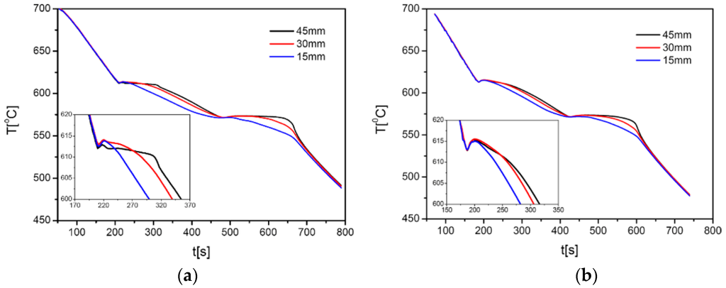 Cooling curves of the solidified Al-7 wt. %Si alloy measured at the height of 30 mm: (a) ECP; (b) TMF.