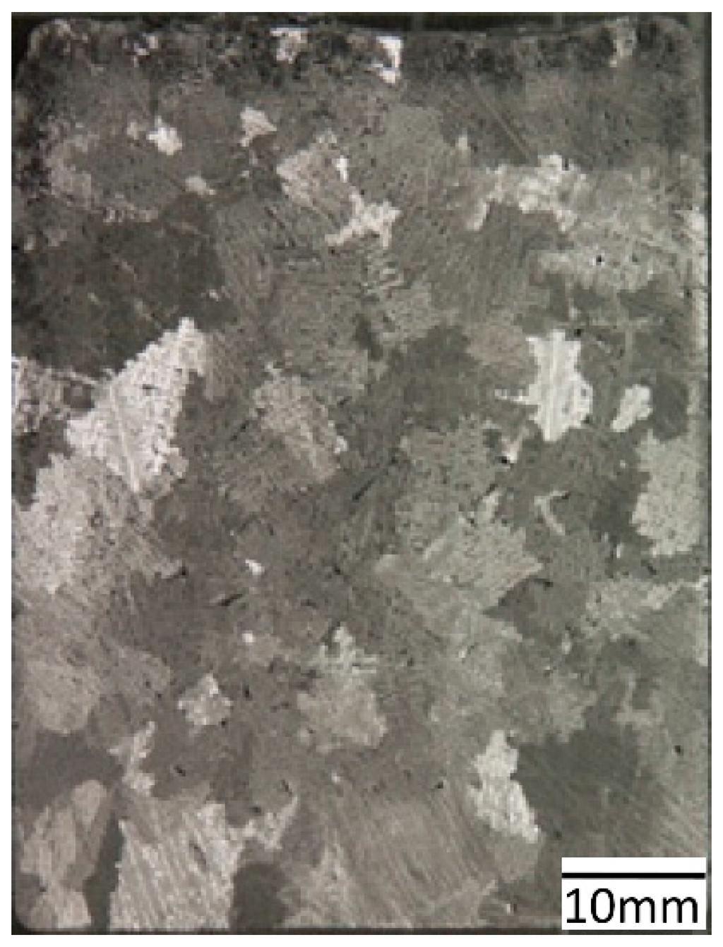 The as-solidified samples for metallographic analysis were longitudinally sectioned along a plane that is perpendicular to the plane containing the two parallel electrodes. One section was ground on SiC paper, etched in a solution of 60 mL HCl, 30 mL HNO3, 5 mL HF, and 5 mL H2O, and directly taken a photo via a digital camera (Konica Minolta, Tokyo, Japan) for the macrostructure analysis. Another corresponding section was employed for the quantitative analysis of grain size. It was ground on SiC paper and polished from 6 μm to 1 μm, electro-etched in Barker etching reagent at 25 V, 15 Hz for 180 s, then photographed by an optical microscope MeF4 (Leica Microsystems, Wetzlar, Germany) with the polarized light. The obtained picture covering the whole sample was used to measure the grain size by the linear intercept method in a software package aquinto a4i (Fa. Aquinto AG). The grain size with measuring error of ±0.08 mm was estimated by performing the measurement in the same sample four times.