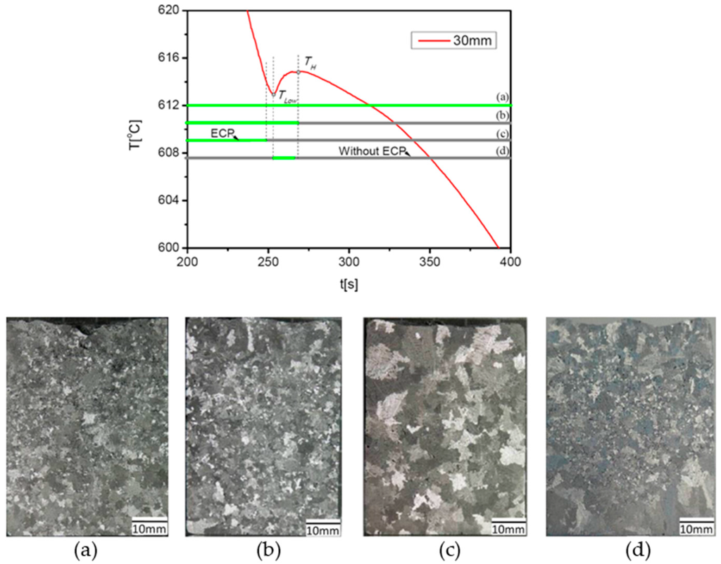 In summary, based on our experimental results and discussion, it is evident that the grain refinement process driven by ECP or TMF is almost the same in the employed solidification regime on account of the fact that their application can cause the same grain refinement occurrence period and the same origins of equiaxed grains. The gained knowledge provides more insights into understanding grain refinement under the influence of electromagnetic fields.