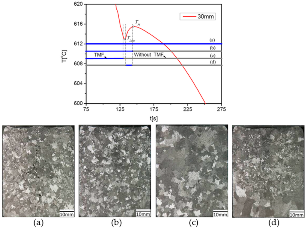 Similar to the solidification experiments with ECP, TMF was applied, respectively, during different solidification periods including the whole solidification period, the initial solidification period, the nucleation period and the recalescence period. The corresponding macrostructures on the longitudinal section of solidified Al-7 wt. %Si samples are presented in Figure 6. In comparison with the reference sample shown in Figure 4, a significant grain refinement occurs by applying TMF from the initial cooling of the sample (about 700 °C) until it is totally solidified or just after the recalescence is completed (see Figure 6a,b). A similar macrostructure is achieved with almost the same grain size of about 1 mm (see Table 1). It implies that the grain refinement caused by TMF is also mainly achieved during the initial solidification period. Figure 6c presents the macrostructure under the treatment of TMF during the nucleation period. The finer equiaxed grains with a grain size of about 2 mm can be observed in the sample, but the grain size is still larger than that in Figure 6a,b. Figure 6d shows that the tiny grains are produced when TMF is only applied during the recalescence period. It suggests that the grain refinement also continuously occurs during the nucleation period and recalescence period.