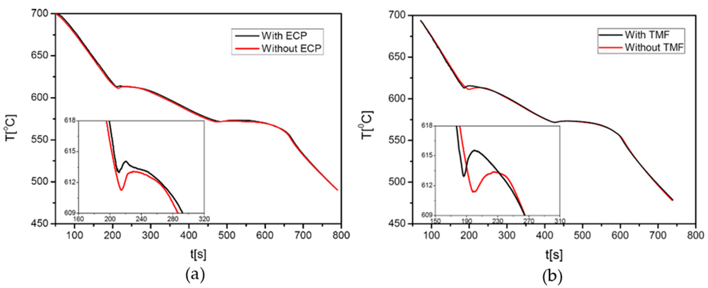 The maximum undercooling ΔT is defined as the difference between the liquidus TL and the lowest temperature point TLow before recalescence occurs (ΔT = TL − TLow, see Figure 7) [25]. It has been reported that the value of maximum undercooling can be influenced by the cooling rate of alloys in liquid state [26]. Hence, it is necessary to set both of the samples with and without the application of external energy fields at the same cooling rate. Figure 8 displays the cooling curves at the core axis with a height of 30 mm measured in the Al-7 wt. %Si alloy with and without the influence of ECP and TMF. Fortunately, it can be seen that almost the same cooling rate and history were achieved in the Al-7 wt. %Si alloy regardless of the application of ECP and TMF. Hence, the effect of ECP and TMF on the maximum undercooling can be investigated convincingly by comparing the cooling curves.