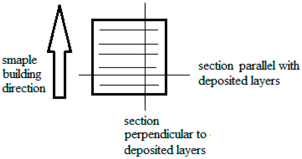 The metallographic analysis of sintered materials was performed in two directions—perpendicular and parallel to deposited layers, Figure 3.