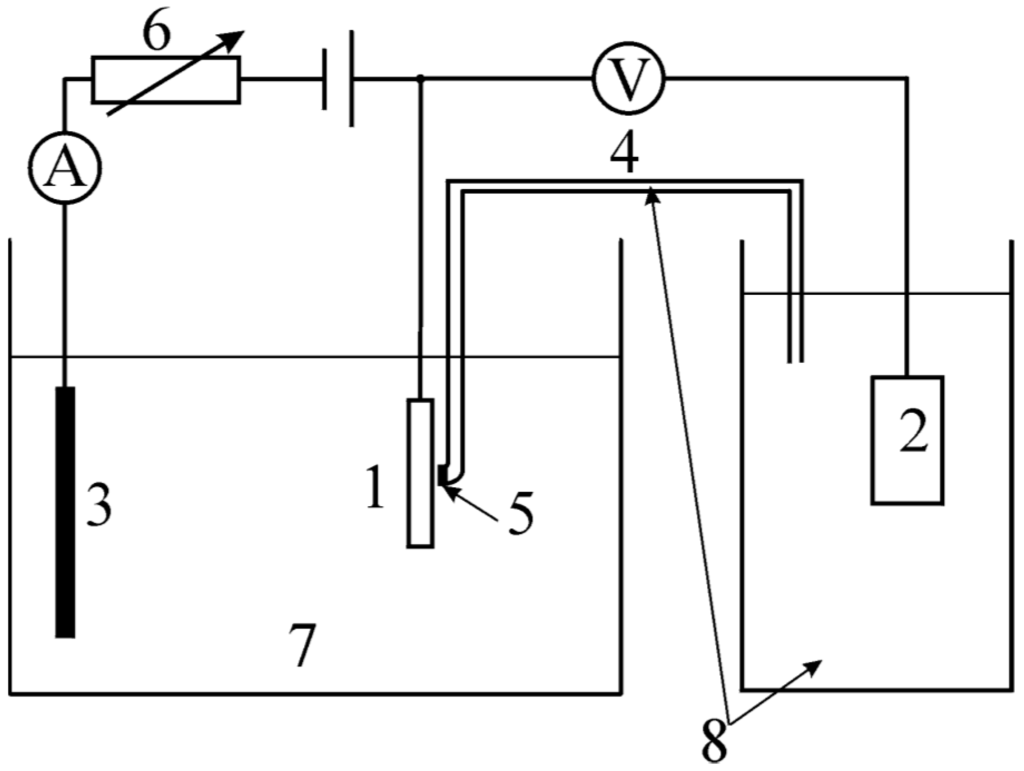 Three electrode system: 1—working electrode; 2—reference electrode; 3—auxiliary electrode; 4—salt bridge; 5—semipermeable membrane; 6—adjustable voltage source; 7—electrolyte; 8—solution of own ions of reference electrode.