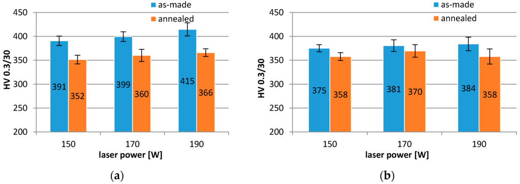 Mechanical properties were studied through hardness of materials. Material hardness showed different values with respect to the orientation of the measurement plane against sample building direction. Hardness of materials increased with laser power and values varying from 370 to 415 HV 0.3/30. After stress-relief annealing, the structure of materials became homogenized, pattern spacing dissolved, and hardness in both directions became stabilized at values of 350–370 HV 0.3/30.