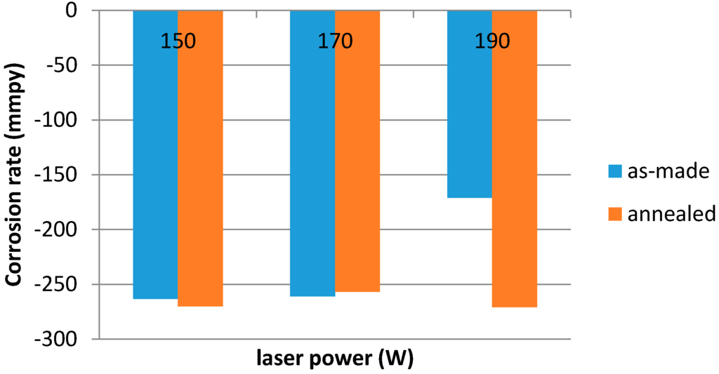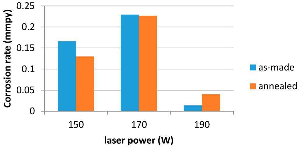 Corrosion rate of materials after 144 h exposure in the test solution, depending on the laser power and heat treatment, is provided in Figure 10.
