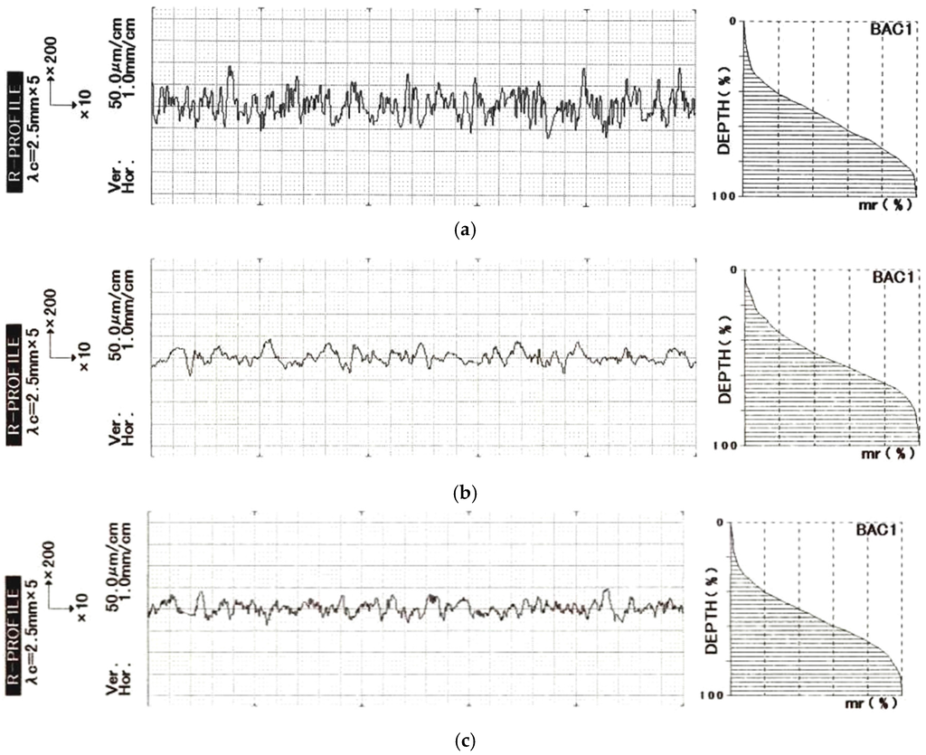 Profiles of materials as-made and blasted. (a) as-made; (b) Zirblast, 0.6 MPa; (c) White corundum, 0.6 MPa.