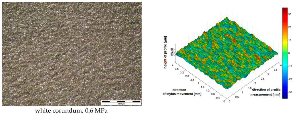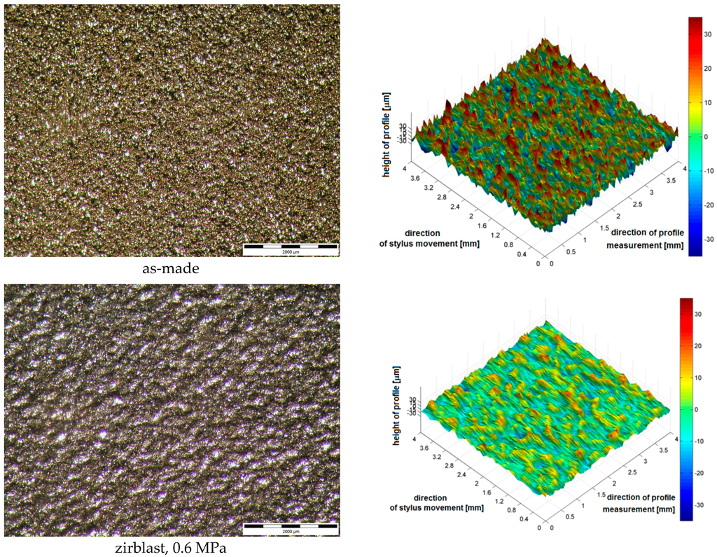 Blasted surfaces were visualized using 3D maps and optical microscopy, Figure 13. 3D image of surfaces clearly showed the influence of blasting abrasives used to the final character of the surface. Surfaces blasted with spherical abrasive—Zirblast—are characterized by mutually intersecting indentations of spherical cap shape. Surfaces blasted with white corundum consist of large number of sharp notches.