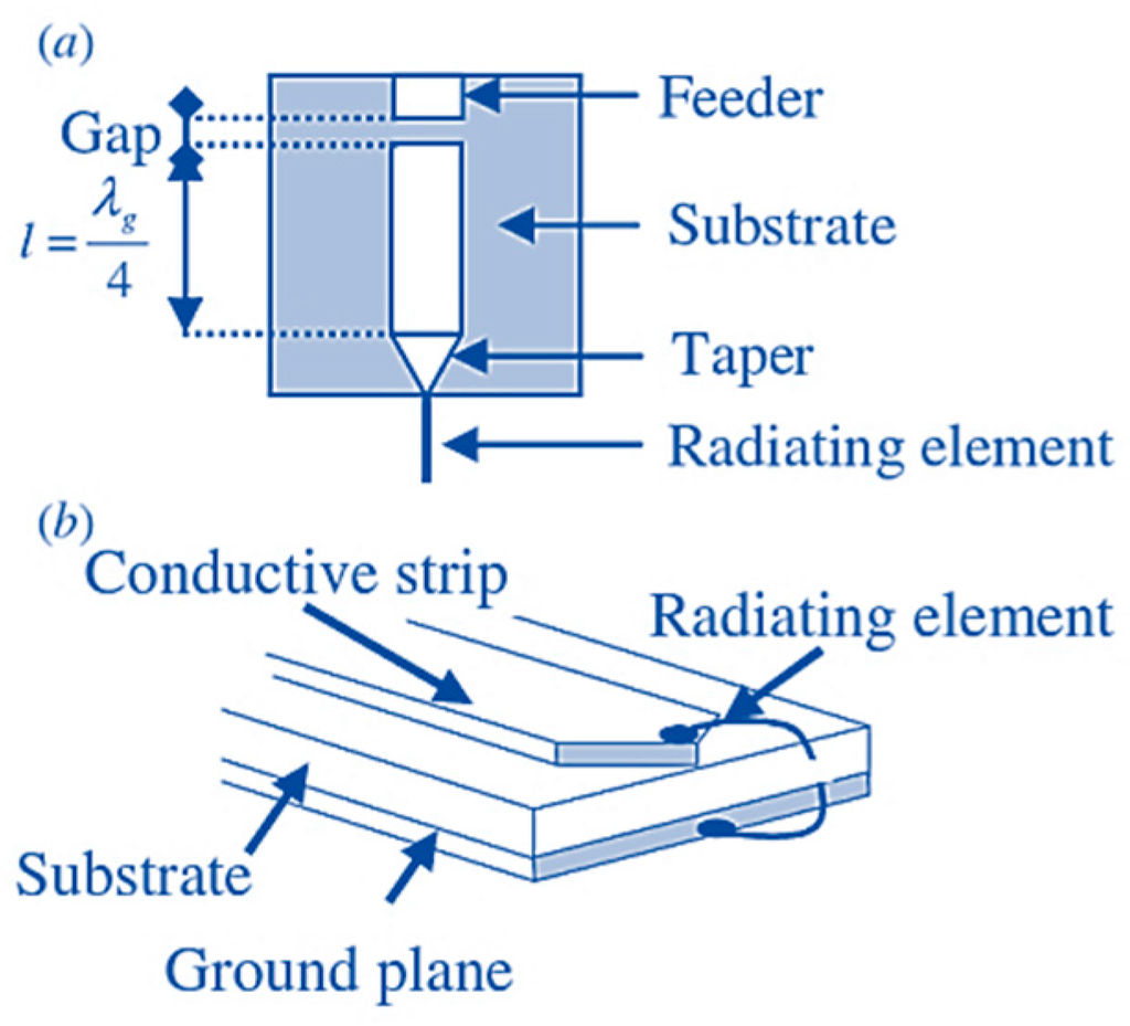 Microstrip resonator design: (a) complete structure; and (b) zoomed in on electric dipole (from [29]; copyright © 2008; redesigned with permission).