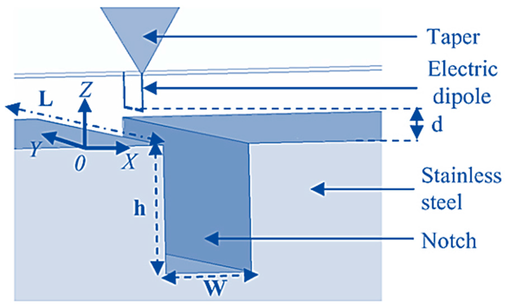 Schematic drawing of the electric dipole probe above a notch. W, h and L represent the width, depth and length of the notch, respectively. d is the probe-to-metal distance (from [29]; copyright © 2008; redesigned with permission).