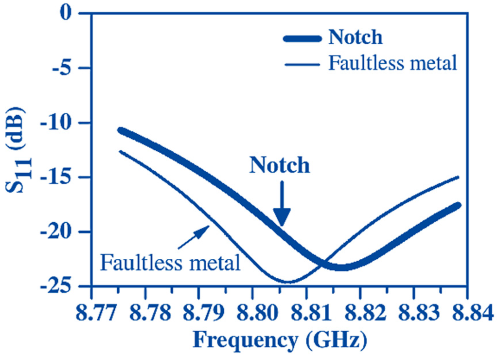 Measured reflection parameter S11 versus frequency above faultless metal and above a 200-μm-wide notch for a probe-to-metal distance d = 50 μm (from [29]; copyright © 2008; redesigned with permission).