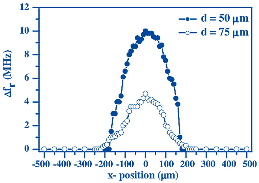 1D scans (x direction) above a stainless steel plate with a 200-μm-wide notch measured with the electric dipole probe for probe-to-metal distances d of 50 and 75 μm, respectively. Variations of the resonance frequency (∆fr) as a function of the x-position; x = 0 corresponds to the middle of the notch (from [29]; copyright © 2008; redesigned with permission).