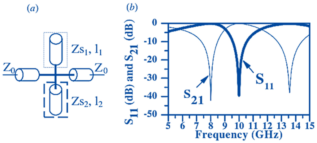 - Quendo, C.; Rius, E.; Person, C. Narrow bandpass filters using dual-behavior resonators based on stepped-impedance stubs and different-length stubs. IEEE Trans. Microw. Theory Tech. 2004, 52, 1034–1044. [Google Scholar] [CrossRef]