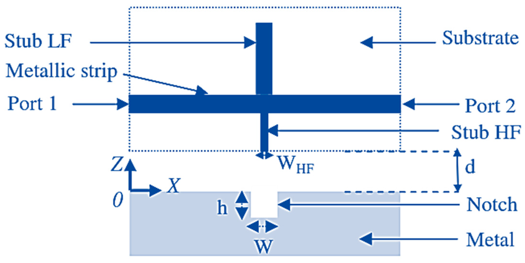 Figure 7a illustrates the design, and Figure 7b presents the reflection (S11) and transmission (S21) parameters of this first-order DBR BPF, constructed on an alumina substrate. The phenomenon of detecting micro-cracks consists of measuring variations in the capacitive coupling between the HF stub (of width W) accompanying the filter’s upper attenuated band and the metal surface. The interaction between the metal plate and the HF stub (which are separated by a distance d) artificially spreads the distance of the latter and drops the transmission zero frequency in the upper attenuated band. The literature on near-field microscopy shows that the spatial resolution of an evanescent probe is governed by the size of the probe end (WHF for the DBR filter) and the probe-to-sample distance d [34,35,36,37]. According to [37], the conditions required to resolve a defect of width W are WHF ≤ W and d ≤ W. Because the purpose of this research is to detect 200-μm-wide surface cracks, it seems pertinent to create two DBR filters with WHF = 50 μm and W = 100 μm. Additionally, the substrate was cut out at the HF stub end to reinforce the radiated electromagnetic field. This phenomenon also augments the coupling between the HF stub and the metal plate. Figure 8 and Figure 9 present a schematic and a photograph of the first-order DBR device used for the detection of micro-cracks on surfaces.