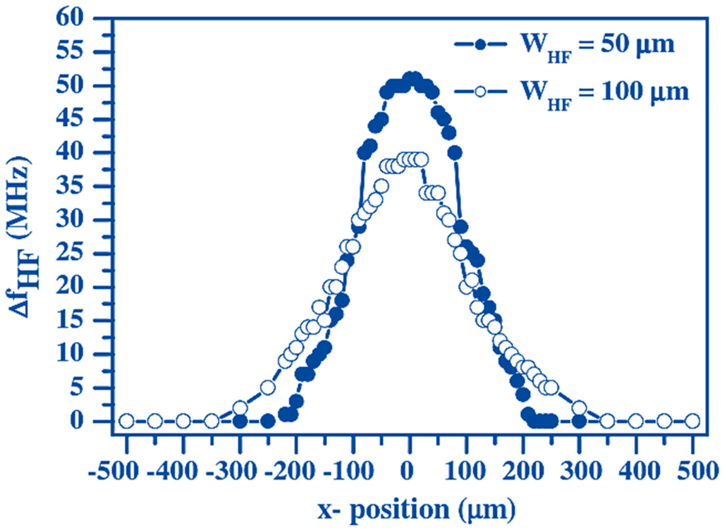 1D scans (x-direction) above a stainless steel plate with a 200-μm-wide notch measured using the 50- and 100-μm-wide high-frequency stub filters for a probe-to-metal distance d = 50 μm. Variations of the high-frequency stub frequency (∆fHF) as a function of the x position; x = 0 corresponds to the middle of the notch (from [29]; copyright © 2008; redesigned with permission).