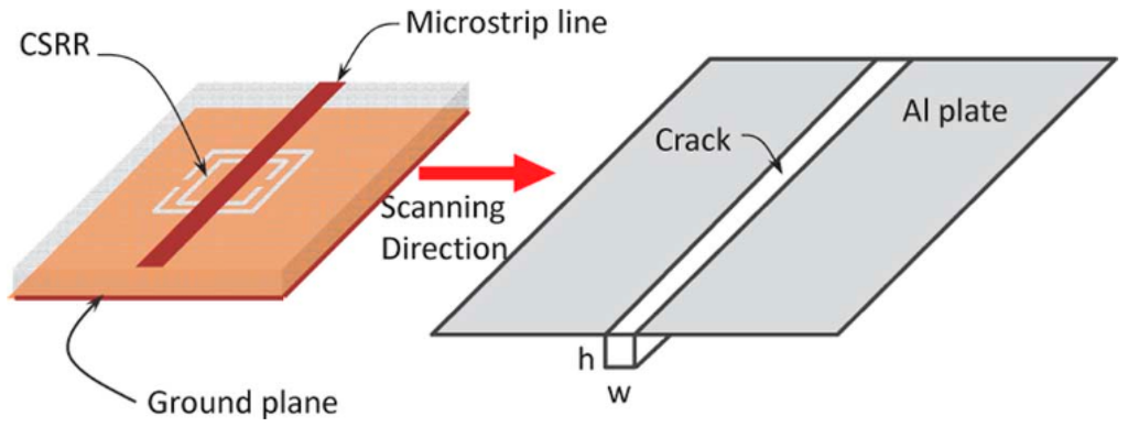 In this section, a new sensor based on a CSRR is presented to detect sub-millimeter surface cracks. The sensing mechanism is based on perturbing the electromagnetic field around an electrically small resonator, thus initiating a shift in the resonance frequency. The sensor is simple to fabricate and inexpensive, as it is etched in the ground plane of a microstrip-line using printed circuit board (PCB) technology. The sensor exhibits a frequency shift of more than 240 MHz for a 100-μm crack [38]. In essence, the CSRR is used as a near-field sensor for crack detection. The effectiveness of the sensor is demonstrated experimentally. The advantages of the CSRR sensor, as compared to the other microwave techniques for crack detection, are lower operating frequency, higher sensitivity and relatively low fabrication cost.