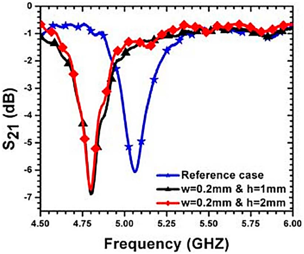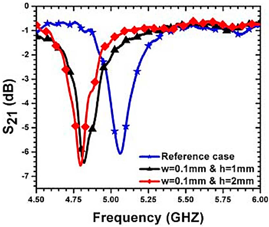 Reflection coefficient of the loop above perfect and defective aluminum boards. w and h are the width and depth of the crack. w is equal to λ0/12, where λ0 is the free-space wavelength (i.e., 5 GHz).