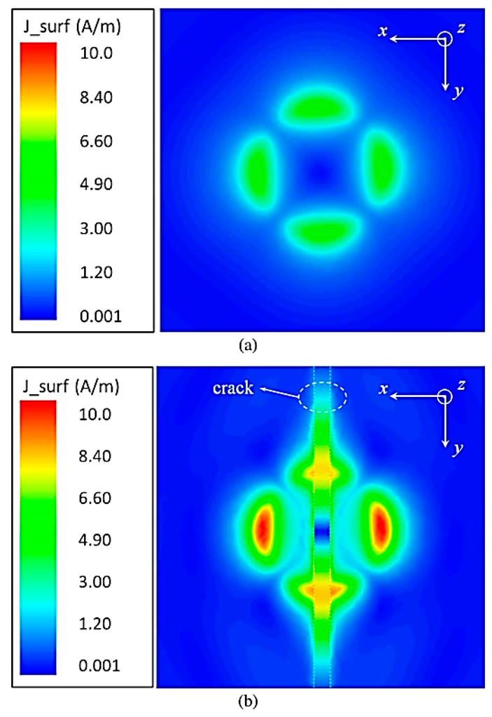 Distribution of the surface current on the aluminum board with/without a long crack. The operation frequency is 4.70 GHz. The distance between the aluminum board and loop is 5 mm. The width and depth of the crack are 5 and 10 mm, respectively. (a) Magnitude of the surface current without a crack; (b) magnitude of surface current with a crack (from [40]; copyright © IEEE 2014; reused with permission).