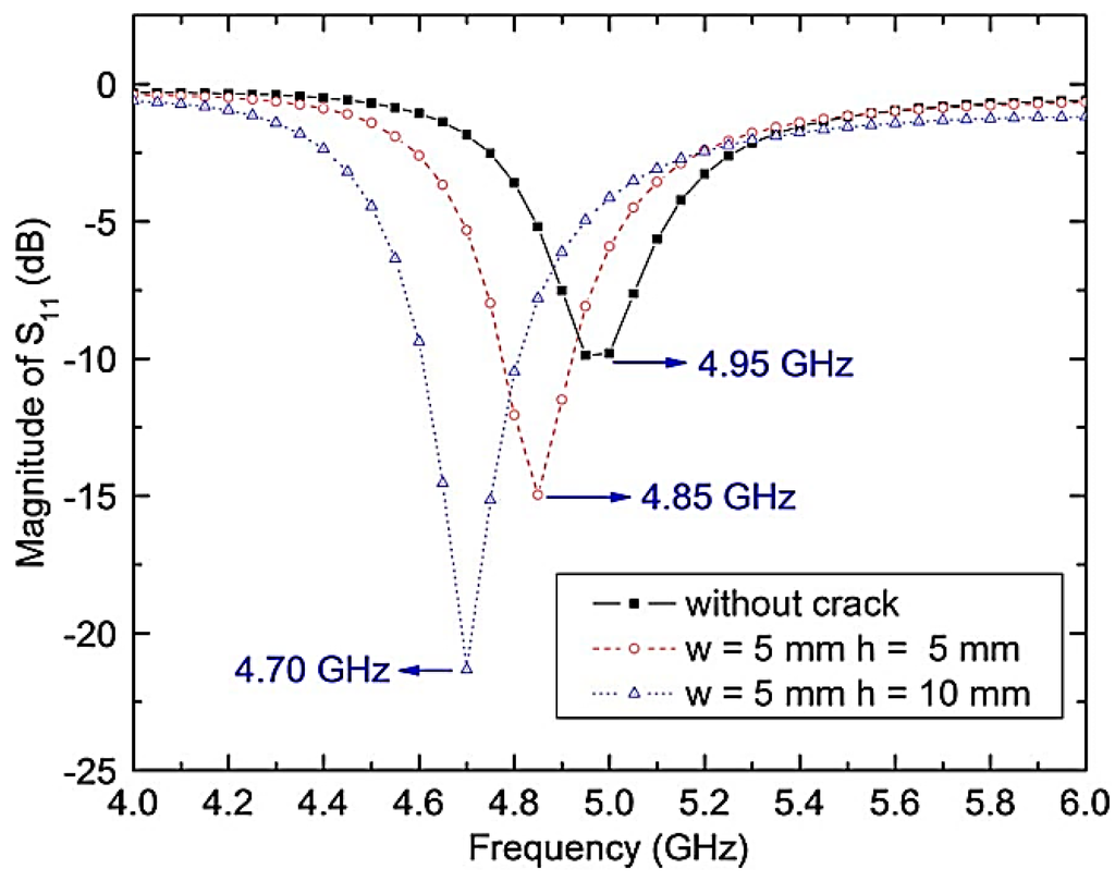 In this section, a high Q and compact CSRR-loaded SIW sensor was proposed for detecting cracks in metals. An SIW cavity and a CSRR were used in combination for the detection and sensing of cracks covered by dielectric coatings. The SIW crack sensor operated at approximately 5 GHz, with a shift of 630 MHz in the resonant frequency observed for a crack of 1 mm in width and 1 mm in depth. Additionally, the sensor reveals a wide variety of resonant-frequency changes with a high QF (i.e., greater than 148). These aspects increase the resolution and sensitivity of the proposed sensor. When compared to other RF crack detection sensors, the proposed sensor functions at a lower frequency and has higher resolution and sensitivity.