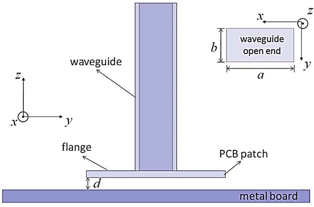 Schematic showing a waveguide probe positioned above a metal board. d is the standoff distance between the waveguide load and the surface of the metal plate (from [40]; copyright © IEEE 2014; reproduced with permission).