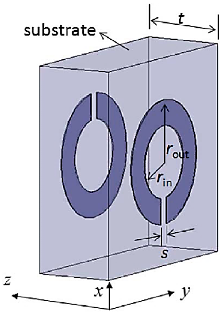 Geometry and dimensions of the SRR resonators. The inner and outer radii of the circular strips are rin = 0.7 mm and rout = 1.2 mm, respectively. The gap width of the circular strip is s = 0.2 mm. The thickness of the substrate is t = 1.524 mm (from [40]; copyright © IEEE 2014; reproduced with permission).