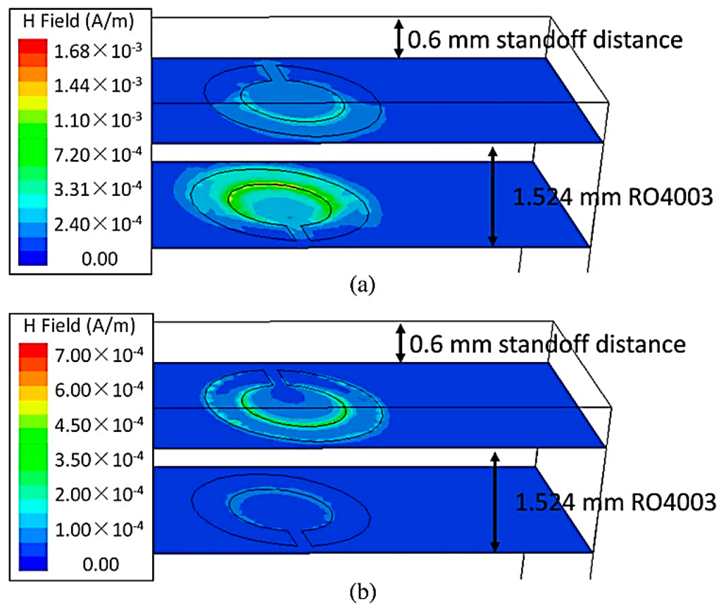 Magnetic field distributions at the resonance frequencies of the SRR cells: (a) at 14.53 GHz and (b) at 16.24 GHz (from [40]; copyright © IEEE 2014; reproduced with permission).