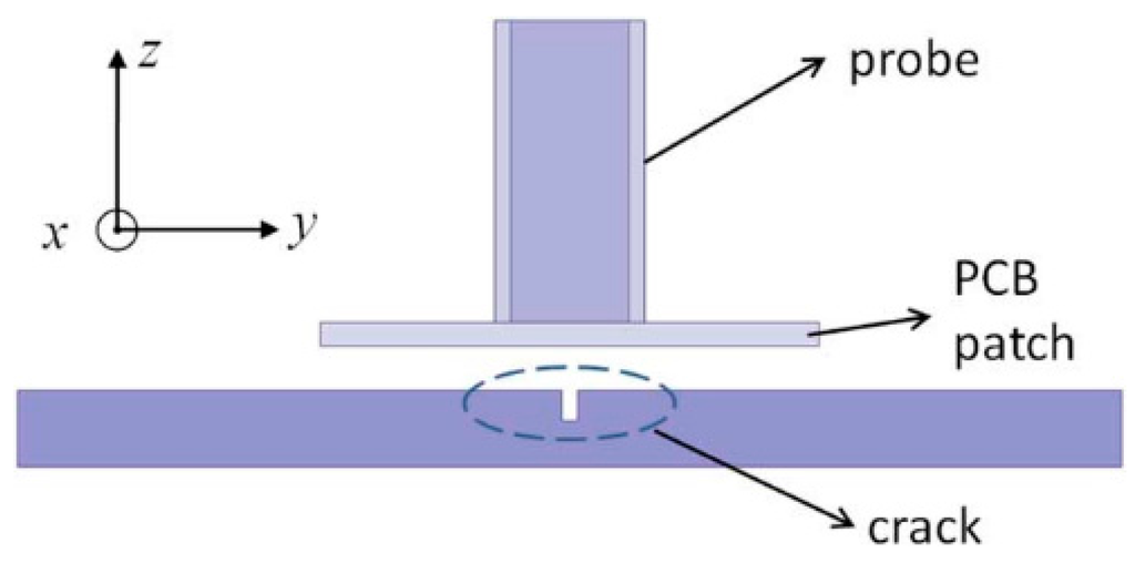 When the metal exterior has an extended and trivial crack, the equivalent electrical current on the surface varies. The modification in the current distribution disturbs the magnetic flux in the ring area. To validate this phenomenon, the authors show the current distribution in Figure 16. In this example, the radius of the ring is 20 mm, and the cross-section is a square with dimension of 1 mm × 1 mm. The characteristic impedance of the feeding transmission line is 50 Ω. This ring was intended to resonate at approximately 5 GHz. The resonant frequency of the ring probe is the frequency that resembles the minimum reflection coefficient when the ring is positioned above a metal surface, as will be described below. The distance between the aluminum board and the loop is 5 mm. The width and depth of the crack are 5 and 10 mm, respectively. Figure 16 shows that the distribution of the current is symmetric with respect to x- and y-directed axes centered at the center of the crack. As a result, the currents on the vertical strip surfaces of the crack provide opposite contributions to the magnetic flux in the loop area. The current on the bottom strip surface of the crack provides the same indication, but less flux, because the strip’s surface is farther from the loop than the currents on the surface. Consequently, the flux from the defective metal surface is reduced. The capacitance, conversely, remains almost unchanged because only the overlapping parts of the loop and crack change. Thus, as an effect of the existence of the crack in the metal’s surface, the resonant frequency of the probe shifts to a lower frequency.