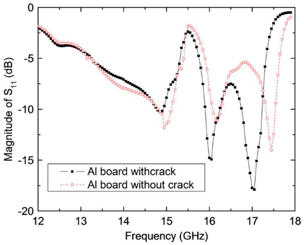Reflection coefficient of the probe with and without a crack. The width and depth of the crack are 0.3 and 2 mm, respectively. The standoff distance between the PCB and the aluminum surface is 0.6 mm in both cases (from [40]; copyright © IEEE 2014; reproduced with permission).