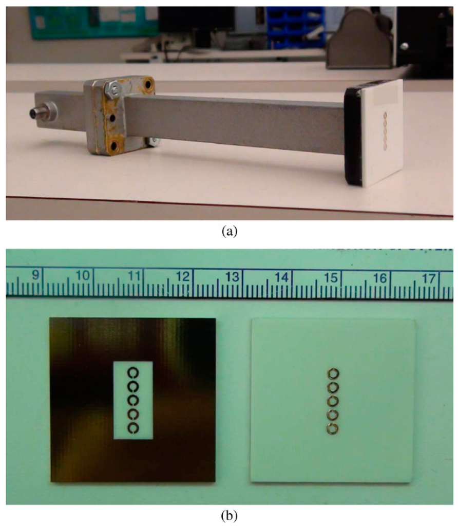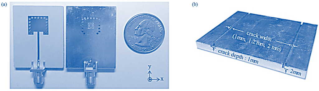 Fabricated sensor and aluminum sample: (a) top and bottom views of the sensor and (b) aluminum sample; (from [41]; copyright © 2014; reproduced with permission).