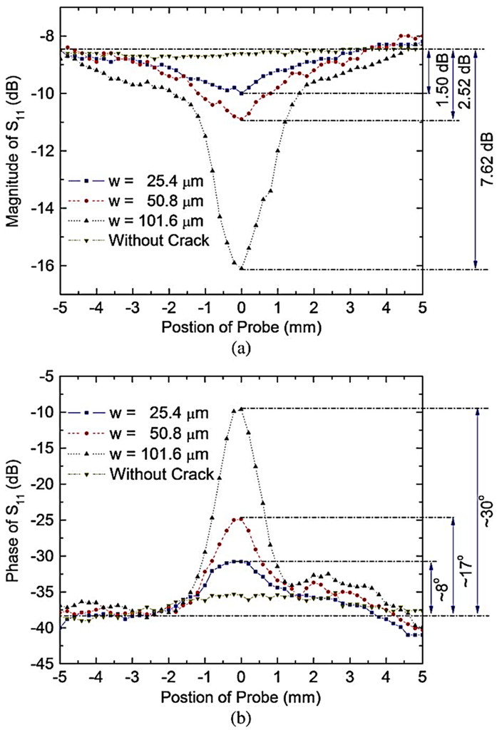 Experimental results for testing cracks with different widths: (a) magnitude response for the probe position and (b) phase response for the probe position. “w” is the width of the crack (from [40]; copyright © IEEE 2014; reproduced with permission).