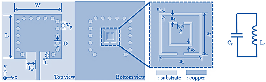 Planar view of the CSRR-loaded substrate-integrated-waveguide (SIW): (a) top view, (b) bottom view, (c) CSRR and (d) lossless equivalent circuit model of the CSRR (from [41]; copyright © 2014; reproduced with permission).