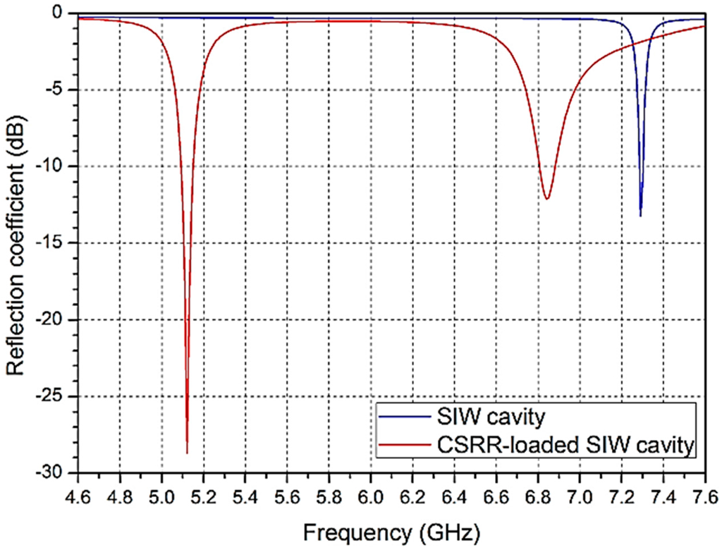 Simulated reflection coefficients of the SIW cavity (without a CSRR) and the CSRR-loaded SIW cavity (from [41]; copyright © 2014; reproduced with permission).