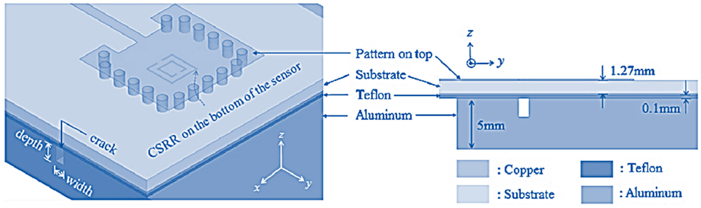 In this section, a high Q and reduced CSRR-loaded SIW RF sensor for the detection of cracks in metals is described. An SIW technology combined with a CSRR with a high Q value are used for realizing high sensitivity. Furthermore, by loading the CSRR on the SIW cavity, the sensor is reduced in size with increased electrical size and can function below the cut-off frequency of the SIW. The presented sensor has a frequency change of 220 MHz for a 100-μm crack and 600 MHz for a 1-mm crack [41]. Additionally, the sensor operates at a low frequency (approximately 5 GHz) with improved resolution and sensitivity [42,43,44].
