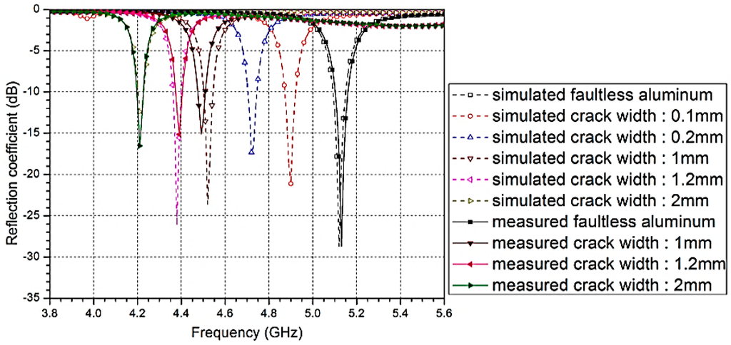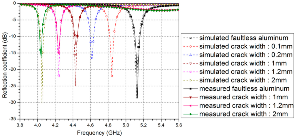 Figure 31 shows the variations in the reflection coefficients when the sensor is located on cracks with several widths; the depth of the crack is maintained at 1 mm. The changes in the resonant frequency due to crack widths of 0.1 mm and 2 mm are 220 MHz and 980 MHz, respectively. When the crack width increases, the resonant frequency tends to decrease. As shown in Figure 32, differences in the reflection coefficients are observed when the sensor is positioned above the cracks of various widths (the depth of the crack is maintained at 2 mm). The changes in the resonant frequency due to the crack widths of 0.1 mm and 2 mm are 280 MHz and 1080 MHz, respectively. The resonant frequency tends to decrease as the crack width increases. To confirm the effect of Teflon thickness, the simulated reflection coefficients are plotted at different thickness of Teflon (t = 0.1, 0.3, 0.5, 0.7 and 0.9 mm) in Figure 33. The resonant frequencies of the faultless aluminum decrease as the thickness of the Teflon coating increases. That is, the resonant frequencies are 5.12, 4.79, 4.67, 4.61 and 4.58 GHz at t = 0.1, 0.3, 0.5, 0.7 and 0.9 mm, respectively. In addition, these frequencies are equated with the resonant frequencies of the faulty aluminum (for a 0.1-mm-width and 1-mm-depth crack). Frequency differences between the faultless and faulty aluminum sheets are 220, 50, 20, 10 and 10 MHz at t = 0.1, 0.3, 0.5, 0.7 and 0.9 mm, respectively. No frequency change can be observed after 0.9 mm in thickness.