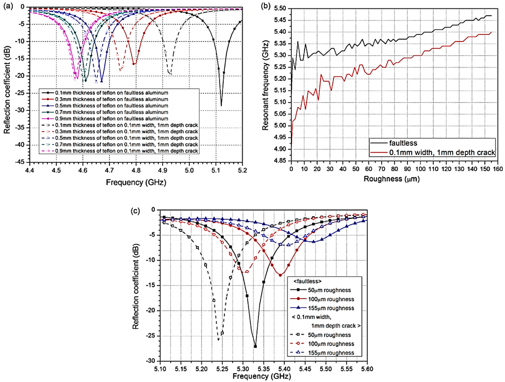 (a) Simulated reflection coefficients at different thicknesses of Teflon; (b) simulated resonant frequencies at different roughness levels on the top Teflon surface; and (c) the simulated reflection coefficients at 50 μm, 100 μm and 155 µm roughness levels on the top Teflon surface for faultless and cracked (0.1 mm in width and 1 mm in depth) aluminum (from [41]; copyright © 2014; adopted with permission).