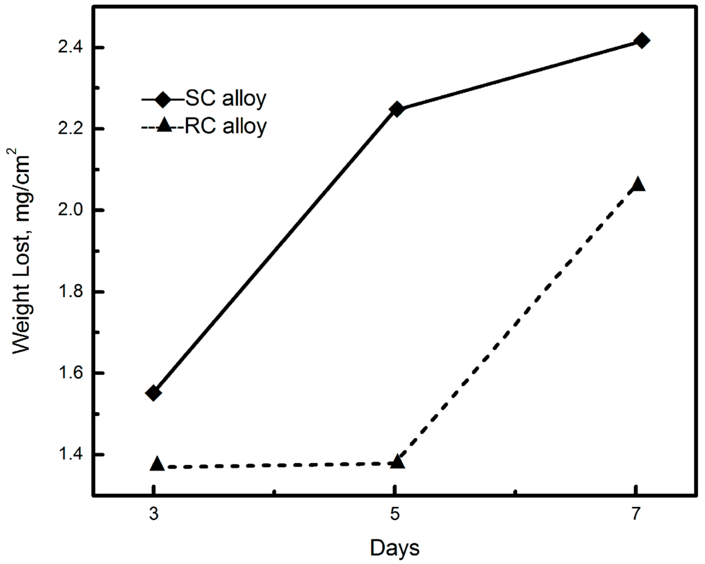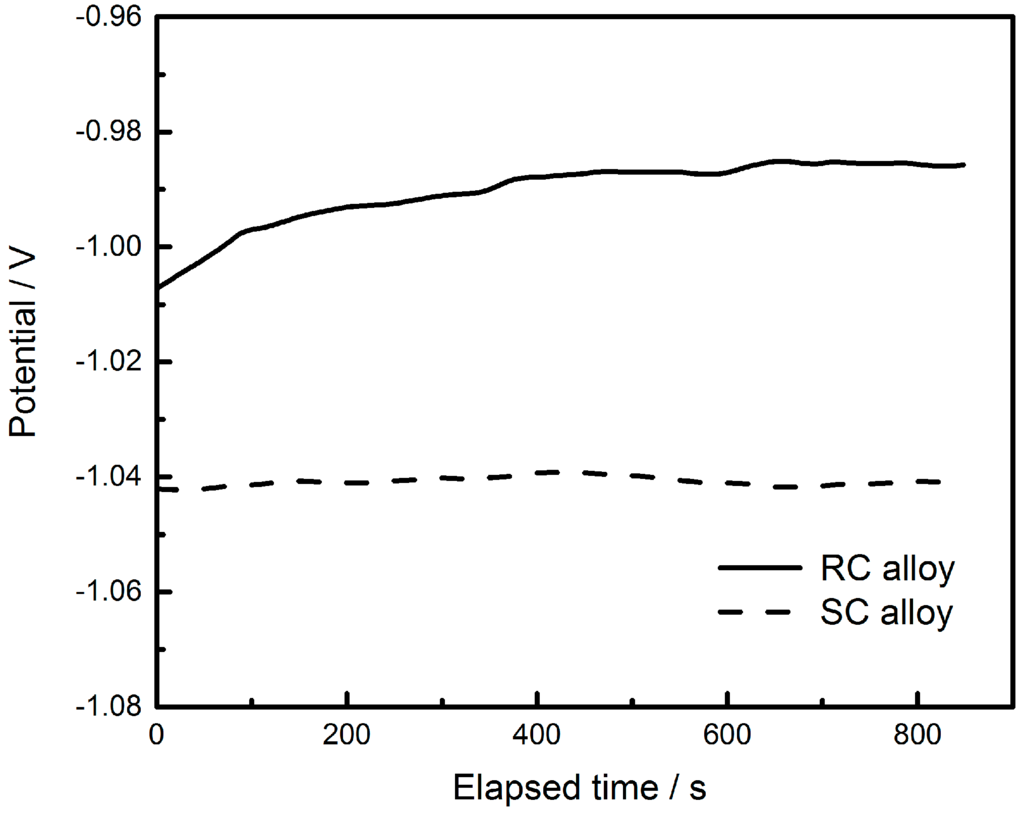 Figure 2 shows the weight loss of the samples as a function of the duration time in 3.5 wt.% NaCl solution. For the slow cooling and rapid cooling Sn–8Zn–3Bi alloy, the weight loss increased with the duration time. Moreover, it needs to be pointed out that compared to Sn–8Zn–3Bi (SC), the alloy with the rapid cooling rate suffers from comparatively less corrosion attack and shows better corrosion resistance. The open circuit potential (OCP) against time (Eocp-t) curves of both alloys measured in NaCl 3.5 wt.% solution are shown in Figure 3. As seen from Figure 3, the values of OCP (EOCP) of Sn–8Zn–3Bi alloy gradually tend to be constant. From a comparison of curves, a positive shift in the EOCP was clearly found when the cooling rate was increased, which reveals that RC Sn–8Zn–3Bi alloy provides better protection.