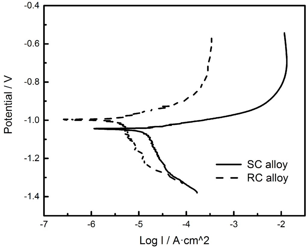 Moreover, polarization curves for the samples are given in Figure 4, and related values extrapolated from the polarization curves are summarized in Table 1. The corrosion potentials (Ecorr) are −1.047 (SC) and −0.999 VSCE (RC) for the Sn–8Zn–3Bi alloys, respectively. It indicates that the value of Ecorr shifts towards the noble value with the increase of the cooling rate. The values of corrosion current density (Icorr) and polarization resistance (Rp) indicate that RC Sn–8Zn–3Bi alloy presents a lower corrosion rate and enhanced corrosion resistance compared to the SC alloy. Due to the same composition of the alloy, these results indicate that the better anticorrosive ability of the RC Sn–8Zn–3Bi alloy is strongly dependent on the transformation of the Zn-rich phase.