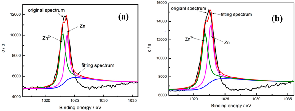 XPS spectrum for Zn2p3/2 obtained from Sn–8Zn–3Bi solder alloy in 3.5 wt.% NaCl solution at room temperature: (a) SC alloy; (b) RC alloy.