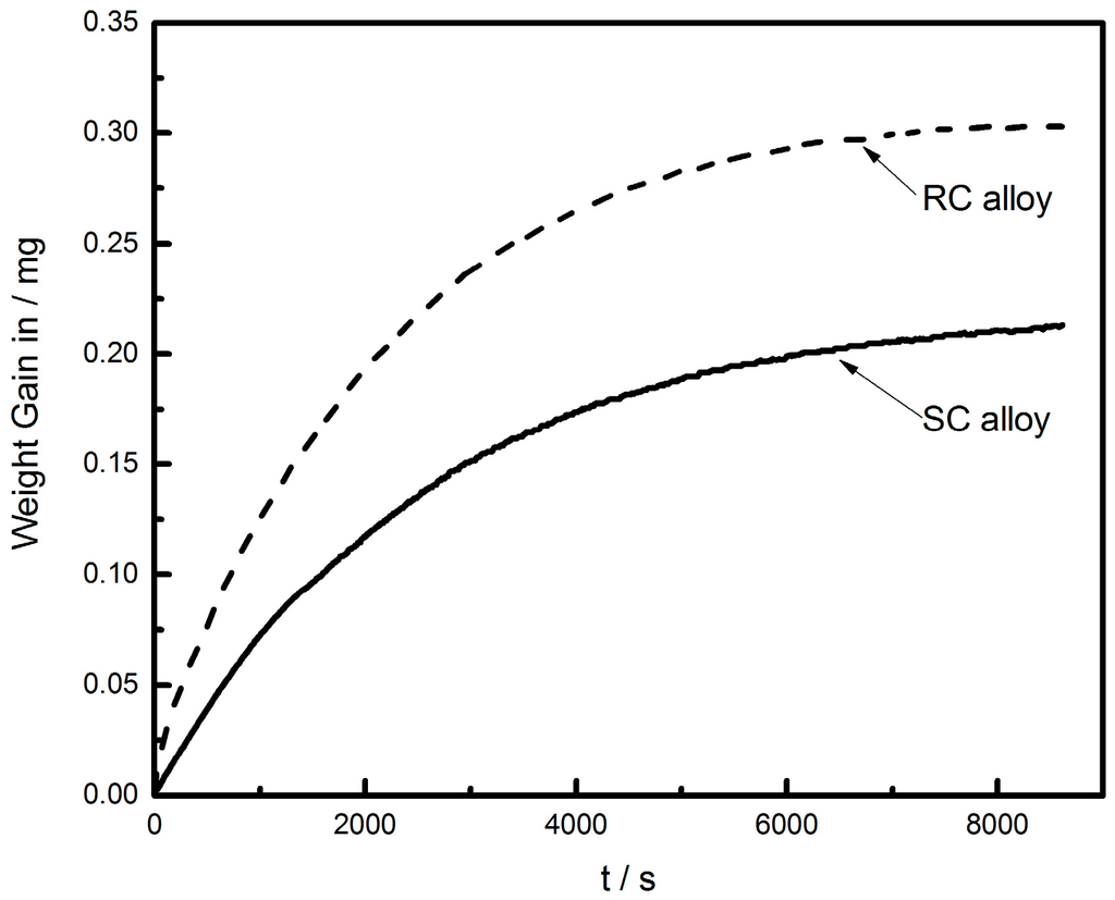 On the other hand, oxidation resistance also plays a significant role in the practical application of the lead-free solder. Figure 7 shows two samples of the time-dependence of the oxidized weight gain for Sn–8Zn–3Bi exposed to air atmosphere by TGA analysis. The weight gain of the alloy increases due to the oxidation of the solder. Interestingly, a more rapid increase is observed for the RC Sn–8Zn–3Bi alloy with a fine Zn-rich phase compared to the SC alloy.
