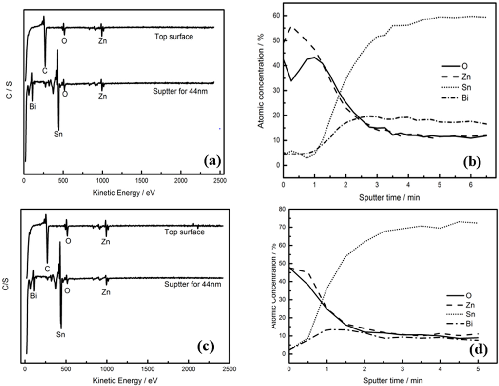 To understand the mechanism of the oxidation of the Sn–8Zn–3Bi solder, the oxidation surfaces of the samples were investigated by Auger analysis and scanning electron microscope. Figure 8 shows the results of the Auger analysis and Auger depth profiles of the two samples. In both specimens, only Zn and O elements were observed on the oxide surface without Bi and Sn. After etching a certain depth (44 nm), Bi and Sn were detected, as shown in Figure 8a,c. The result implies that the oxide ZnO prefers to form on the free surface of the samples.