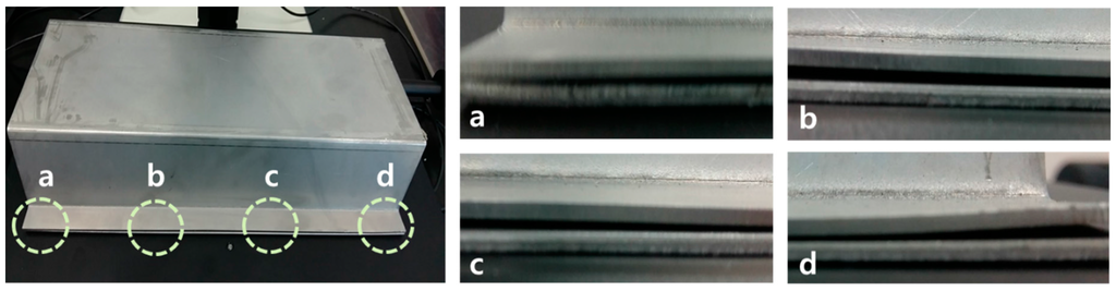 In general, individual part variations caused by the deformation of metal sheets result in unexpected gaps between the upper (top) and lower (bottom) parts, as shown in Figure 1. Hence, tight part-to-part gap control is required to ensure the assembly joint quality of the galvanized steel sheets; these sheets are characterized by the lower evaporation point of Zn (906 °C) than the melting point of Fe (1538 °C). The vaporized zinc gas hampers the formation of stabilized keyholes and often causes serious weld defects such as porosity, spatter, intermetallic brittle phases, and discontinuities formed by zinc vapor entrapment in the welding joints [].