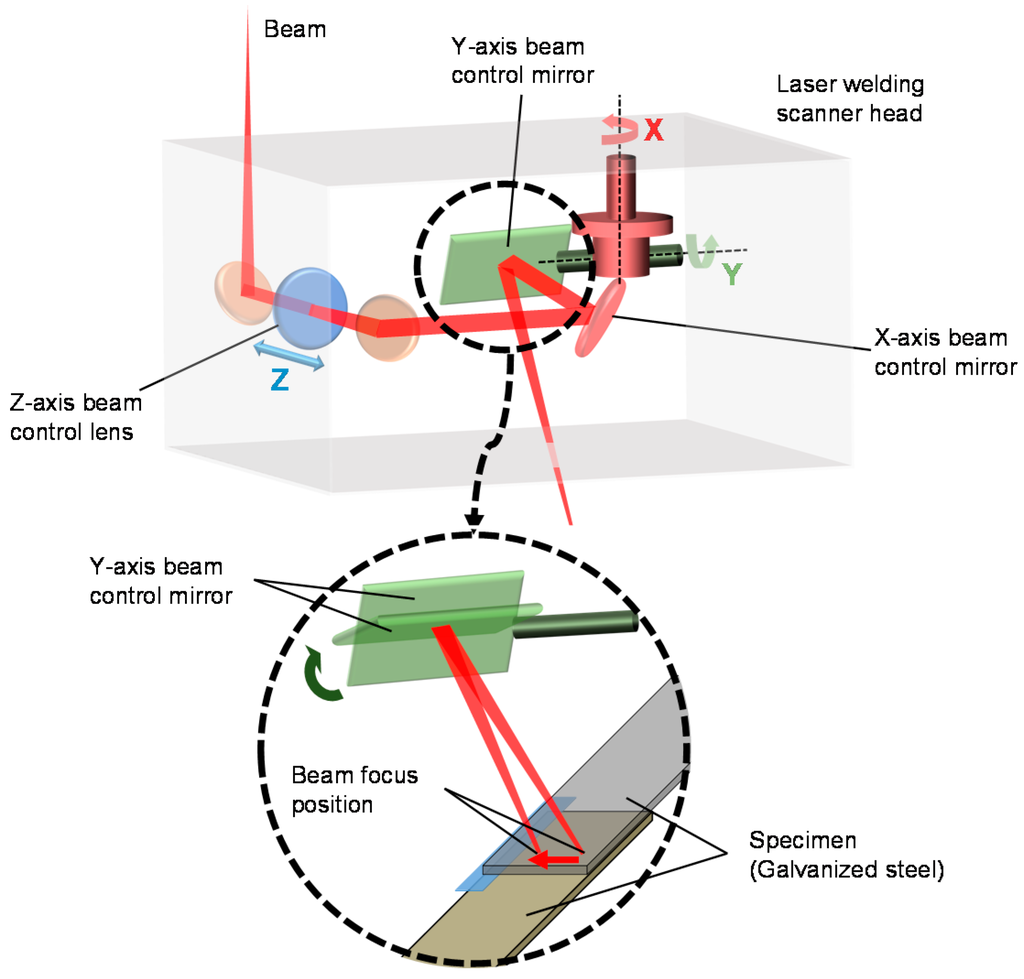 A schematic illustration of a laser welding scanner head that can easily change the direction of welding.