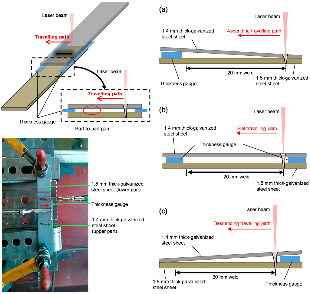 As shown in Figure 1, these gaps are very often non-uniform because of individual part variations in the galvanized steel sheets. In order to simplify these random part-to-part gaps for the experiment, we linearized the travelling paths of the laser into only three linear types: ascending, descending, and flat, depending on the angles of elevation and depression from the perspective of the heading direction of the laser beam. In other words, we created part-to-part gaps and ascending (Type A), flat (Type B), and descending (Type C) travelling paths of welding by inserting a conventional metal thickness gauge (thickness: 0.3 mm, 0.5 mm) between the upper and the lower parts that were to be joined.