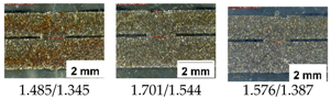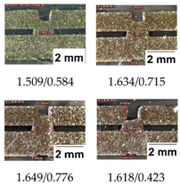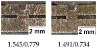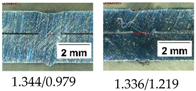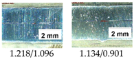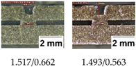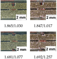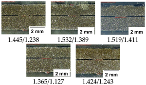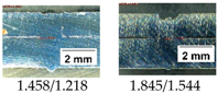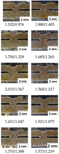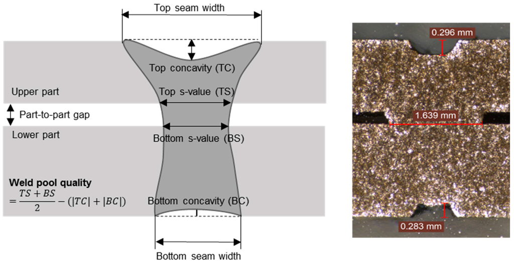 The surface appearance and cross sectional macrostructure significantly affects the weld quality, which is tensile shear strength, as shown in the previous works by Sinha et al. [] and Wei et al. []. Chen et al. [] also investigated relations between geometry of weld seam and tensile strength using conventional destructive techniques for measuring the geometry of the weld seam and tensile strength. Ceglarek et al. [] used the measures as the key joint quality indicators to monitor laser welding process and simultaneous joint quality evaluation. Especially on concavity, Westerbaan et al. [] observed higher amount of concavity reduced the tensile strengths and fatigue resistance. Based on the related works, the concavities as well as the s-value but should be considered as quality measures. We defined the weld pool quality by considering the top and the bottom s-values and concavities, as follows: