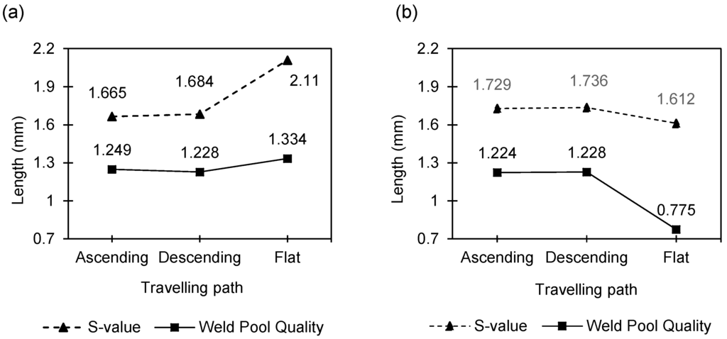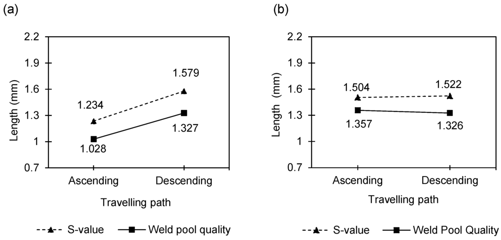 Main effect plots of the average s-value and weld pool quality in terms of the travelling path for experiment (a) #2-1 (laser power: 2 kW, part-to-part gap: 0.5 mm) and (b) #2-2 (laser power: 4, 5, and 6 kW, part-to-part gap: 0.5 mm).