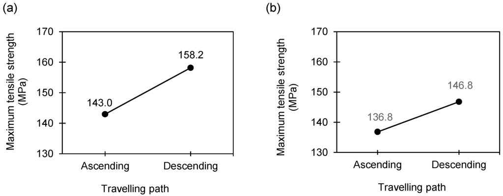Main effect plots of maximum tensile strength in terms of the travelling paths for experiment (a) #3-1 (laser power: 2 kW, part-to-part gap: 0.3 mm) and (b) #3-2 (laser power: 4, 4.5, 5.5, and 6 kW, part-to-part gap: 0.3 mm).
