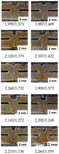 Results of experiment #3-1 (Table 15) indicated that the travelling path under the condition of in-tolerance part-to-part gap and low laser power had statistically significant effects on the maximum tensile shear strength at the 0.05 level of significance. Furthermore, the descending travelling path yielded better results than the ascending path, as shown in Figure 7a. The results of experiment #3-2 (Table 16) showed that changes in the travelling path during laser welding did not influence the tensile strength in the case of a relatively high power laser source under the condition of in-tolerance part-to-part gap. However, from the main effect plot shown in Figure 7b, we observed the tendency of joining quality: the descending travelling path outperformed the ascending one. There is a similar tendency when we are dealing with the weld pool quality. Based on the results, weld pool quality can be an indirect measure of the tensile shear strength.