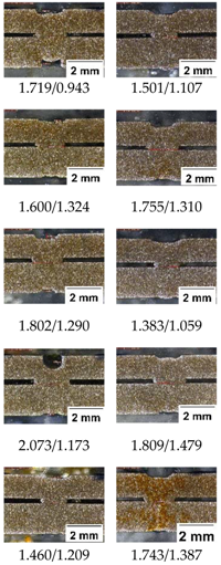 To analyze the result further, we conducted additional experiments considering a new joining quality measure, namely, the tensile strength of the weld. The tensile tests of welds were conducted using the testing instruments, INSTRON 5982 (100 kN capacity, INSTRON, Norwood, MA, USA). The tested specimen and setup was exactly the same with the experiments #1 and #2 (see Table 5).